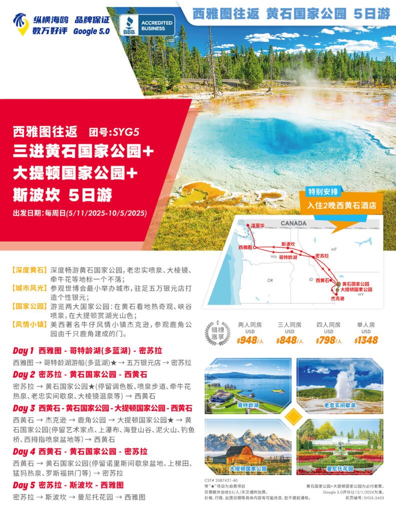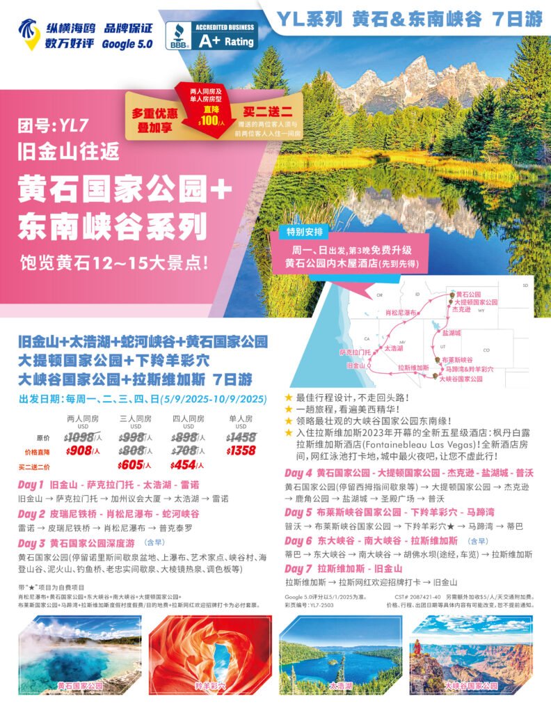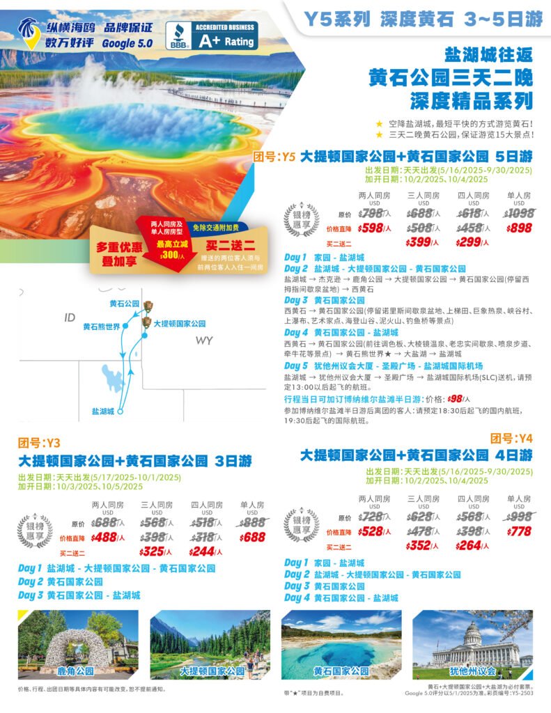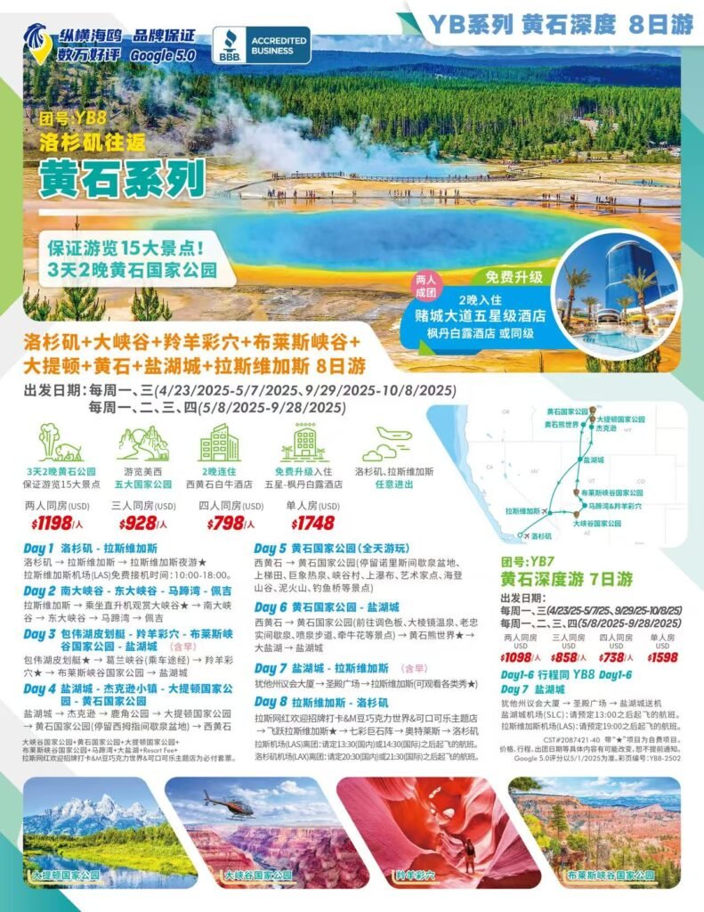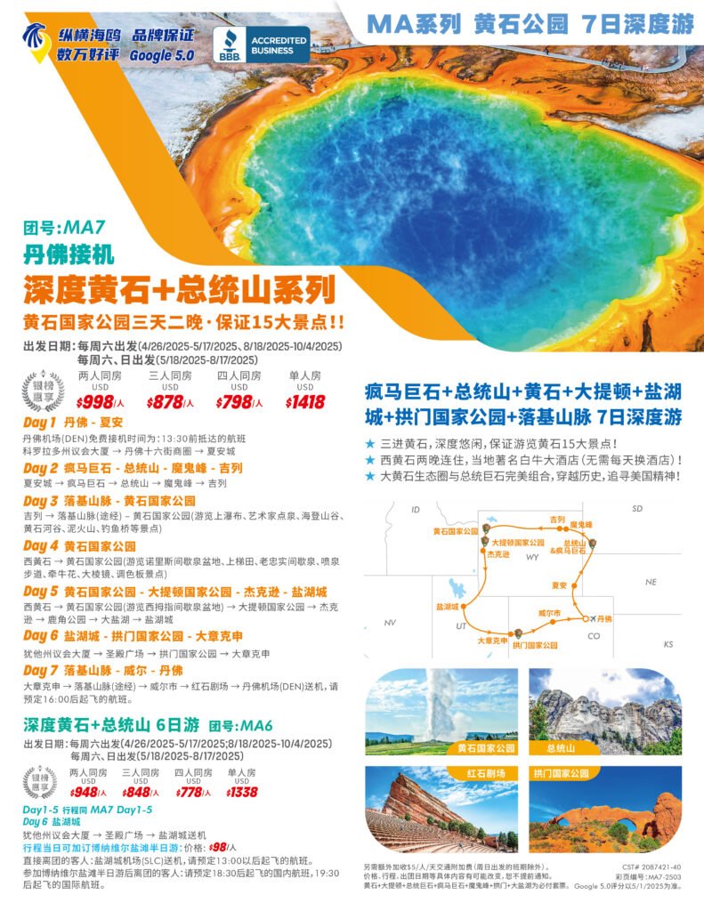 如果您不想绞尽脑子的计划自己的行程,预定订酒店机票和租车这些繁琐的工作,那么跟团游无疑是一个非常不错的选择。去黄石公园,有很多可以供您选择的行程和路线。