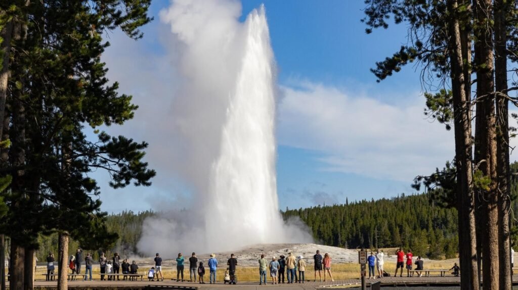 在黄石国家公园的广阔天地中,有一个让人屏息等待的自然奇观——老忠实间歇泉(Old Faithful)。它不像别的地热景观那样神秘莫测,而是像一位守时的老朋友,准时地喷薄而出。每隔大约90分钟,它将喷出40多米的水柱,喷出的水温可高达95℃左右,像一首从地底深处奏响的交响乐,让你瞬间感受到大地的力量和节奏。